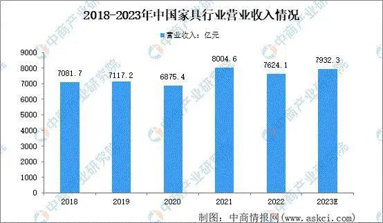 數(shù)據(jù)顯示,2022年受疫情和外貿(mào)等因素影響,我國家具行業(yè)規(guī)模以上企業(yè)實現(xiàn)營業(yè)務(wù)收入7624.1億元,同比下降-4.8%。回顧2018-2022年家具制造業(yè)營業(yè)收入情況:近年來,我國家具制造業(yè)營業(yè)收入總體呈小幅度下降趨勢,預(yù)計2023年我國家具行業(yè)復(fù)蘇營業(yè)收入將達7932.3億元。