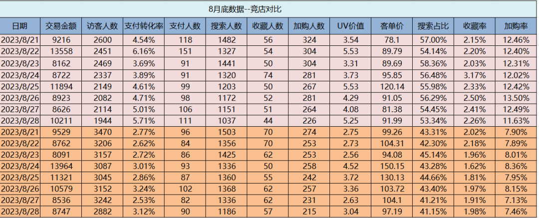 “了解競店的爆款產品,進行數據對比。因為各個店鋪結構的不同,我們會進行對應的改變,使用差異化競爭。”光灝告訴我們,“每周競店數據進行對比,持續感知競店的實時動向,避免運營品牌店鋪被超越?!?/span>