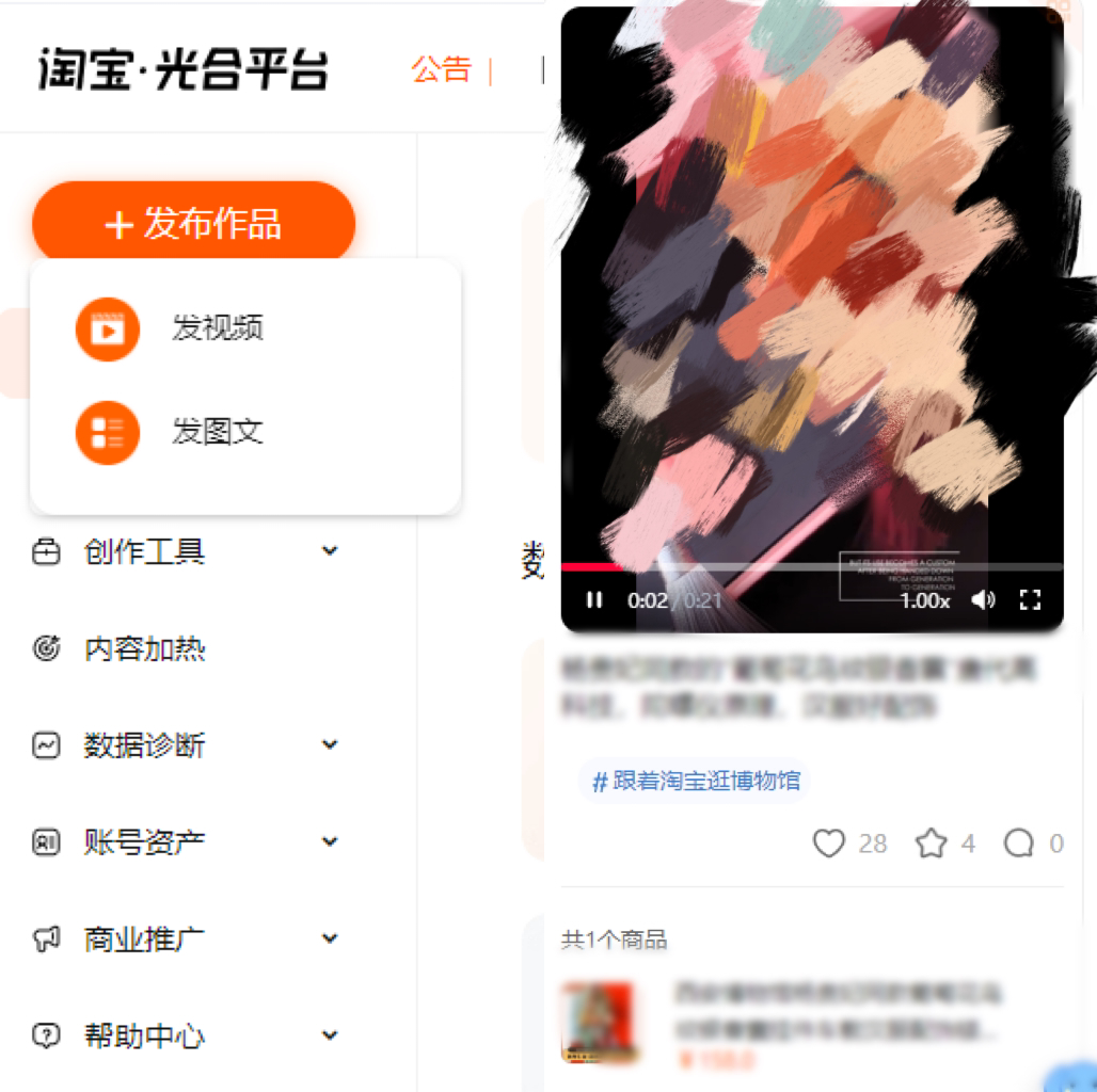第三步發布光合平臺:制作完成后的視頻來發布光合平臺,選擇發視頻(視頻滿足條件:mp4、mkv、mov格式上傳,720p 以上,文件最大1.5G,時長15分鐘以下)。編輯其產品相關的標題和文案,添加當時的熱點話題“跟著淘寶逛博物館”,同時添加對應產品的跳轉。每周進行發布4-5篇內容,來持續曝光產品獲得對應流量,開始店鋪幾乎沒有內容流量,發布引導訪客數增加2w+。