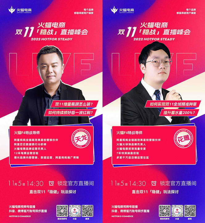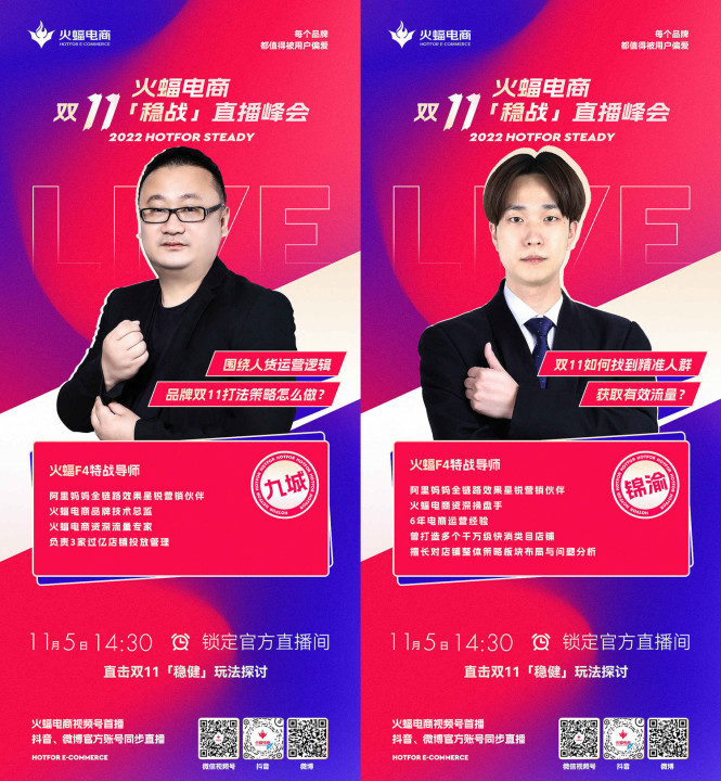 11月5日14:30,敬請關注火蝠電商視頻號,與特戰(zhàn)導師們一起「穩(wěn)戰(zhàn)」雙十一。