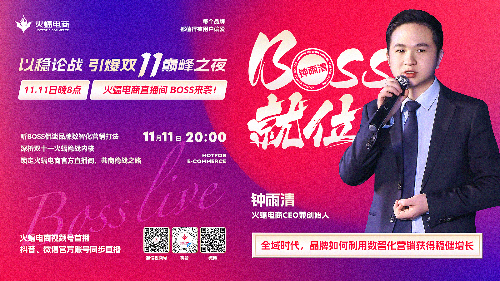 11月11日晚8點,敬請關注火蝠電商視頻號官方直播間,與火蝠電商CEO鐘雨清一起「穩戰」破局,引爆雙十一巔峰之夜。